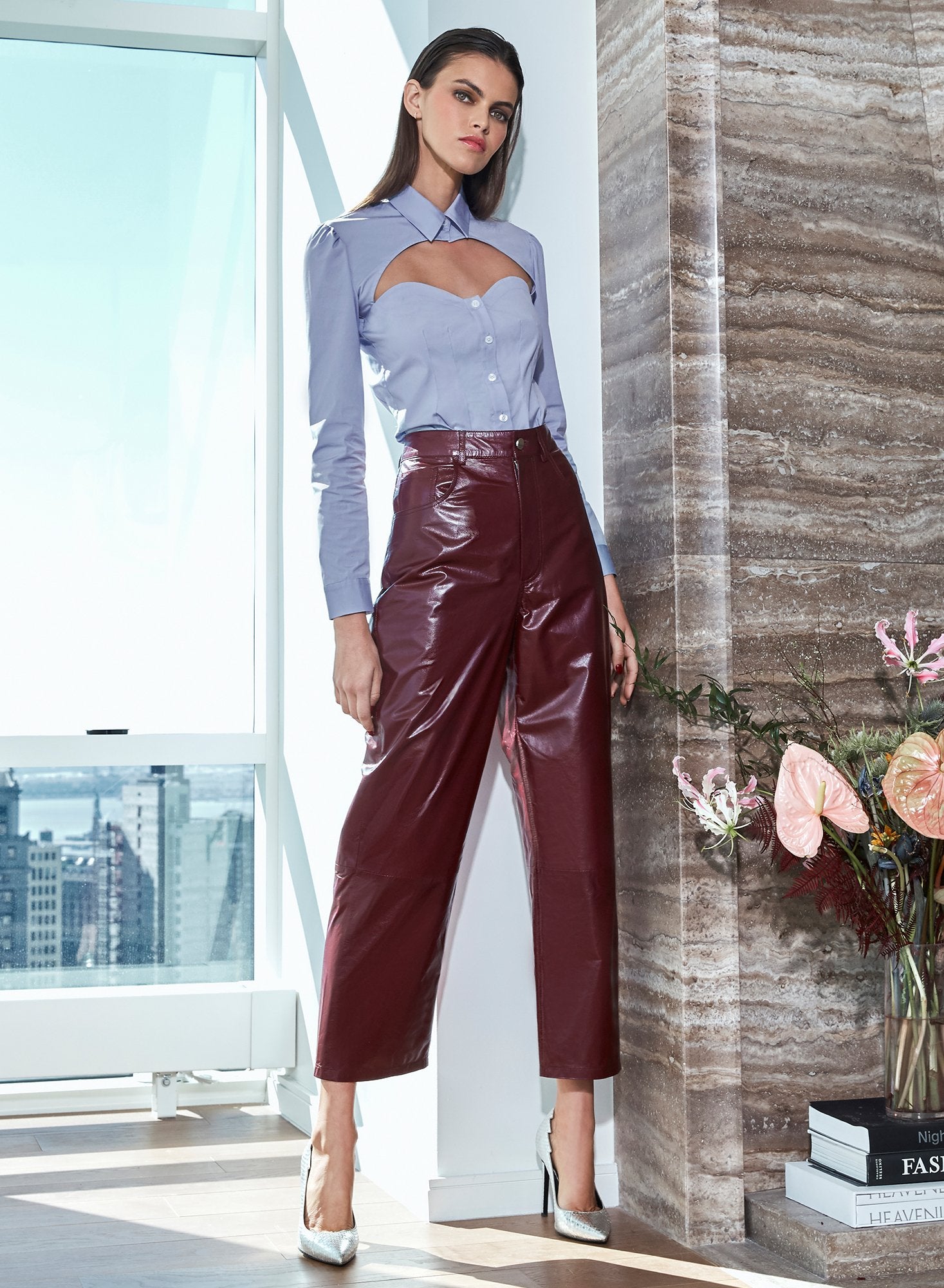Give your décolleté the attention it deserves. Our Bella Shirt features cutout chest with a sweetheart neckline and collar button detail. Ultra flattering princess seaming to add shape. Pair with the Leather V-Yoke Pant or your favorite jeans for a chic and sexy day to night look.