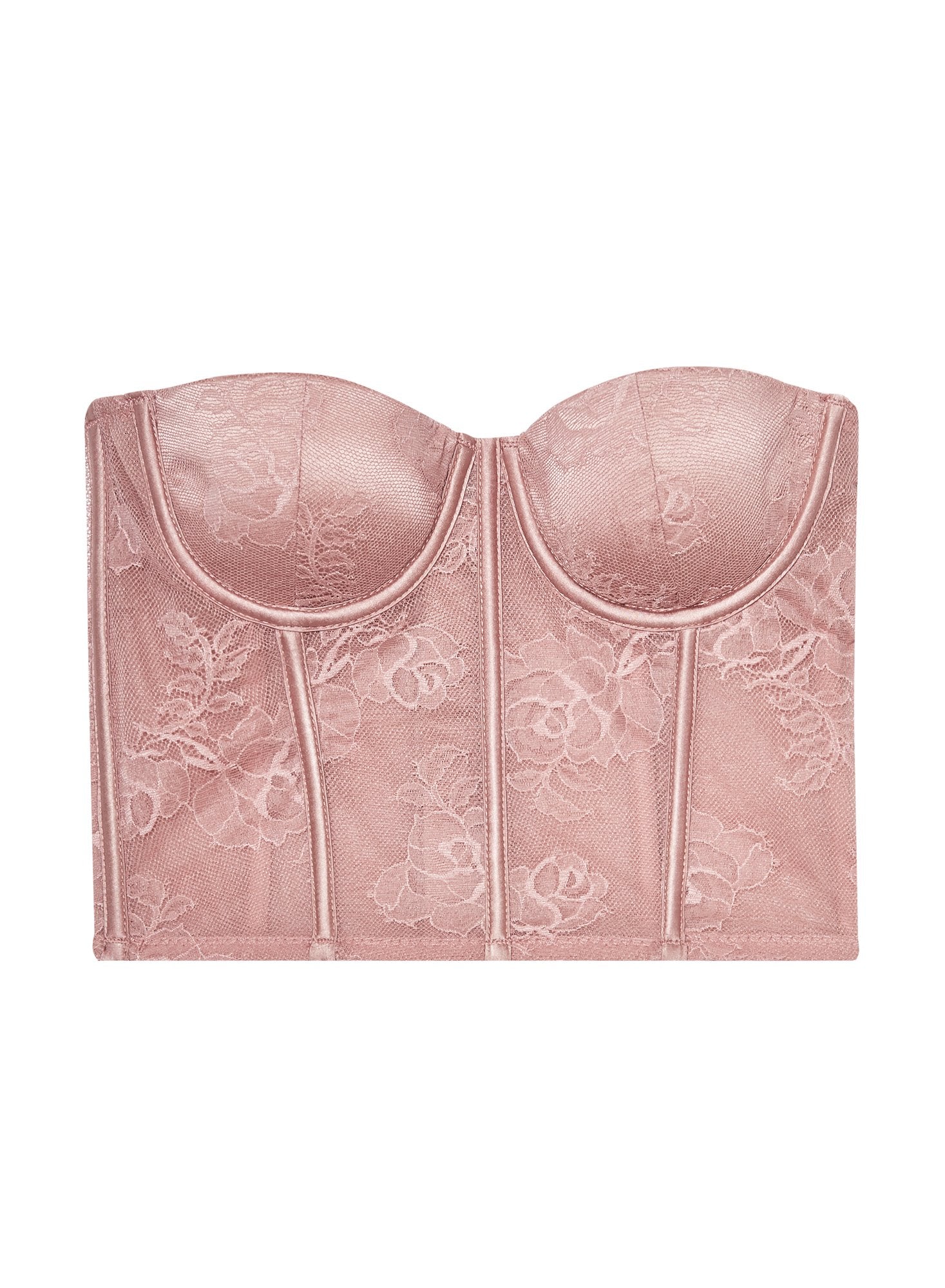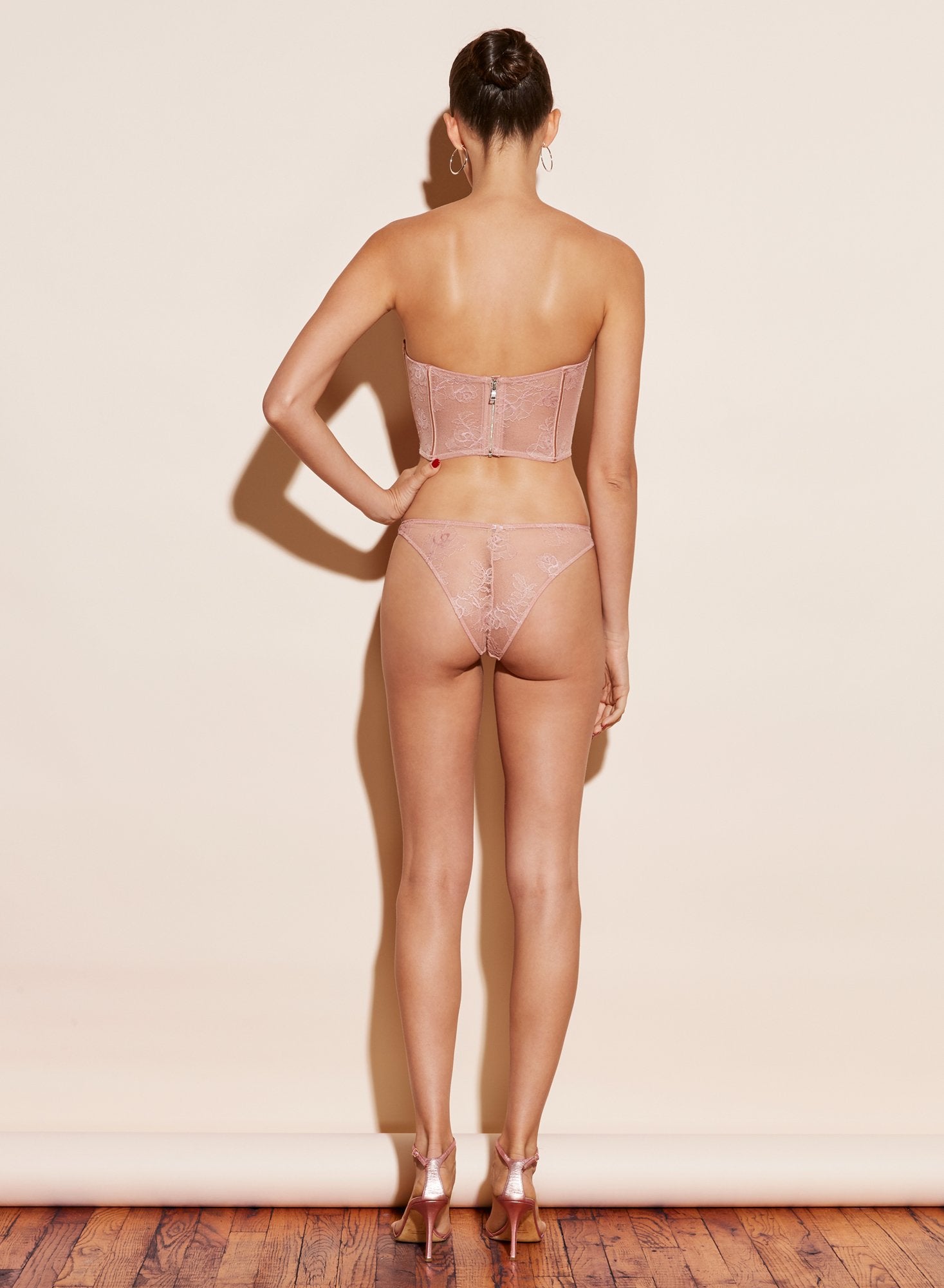 Bare it all. Our little rosewater Bouquet Lace Strapless Bustier top. Made with French Leavers Lace. Soft boning with structured cups gives you natural shape and lift. Zipper closure and subtle, stretch ribbing in back. Pair with the matching Bouquet Lace Cheeky.