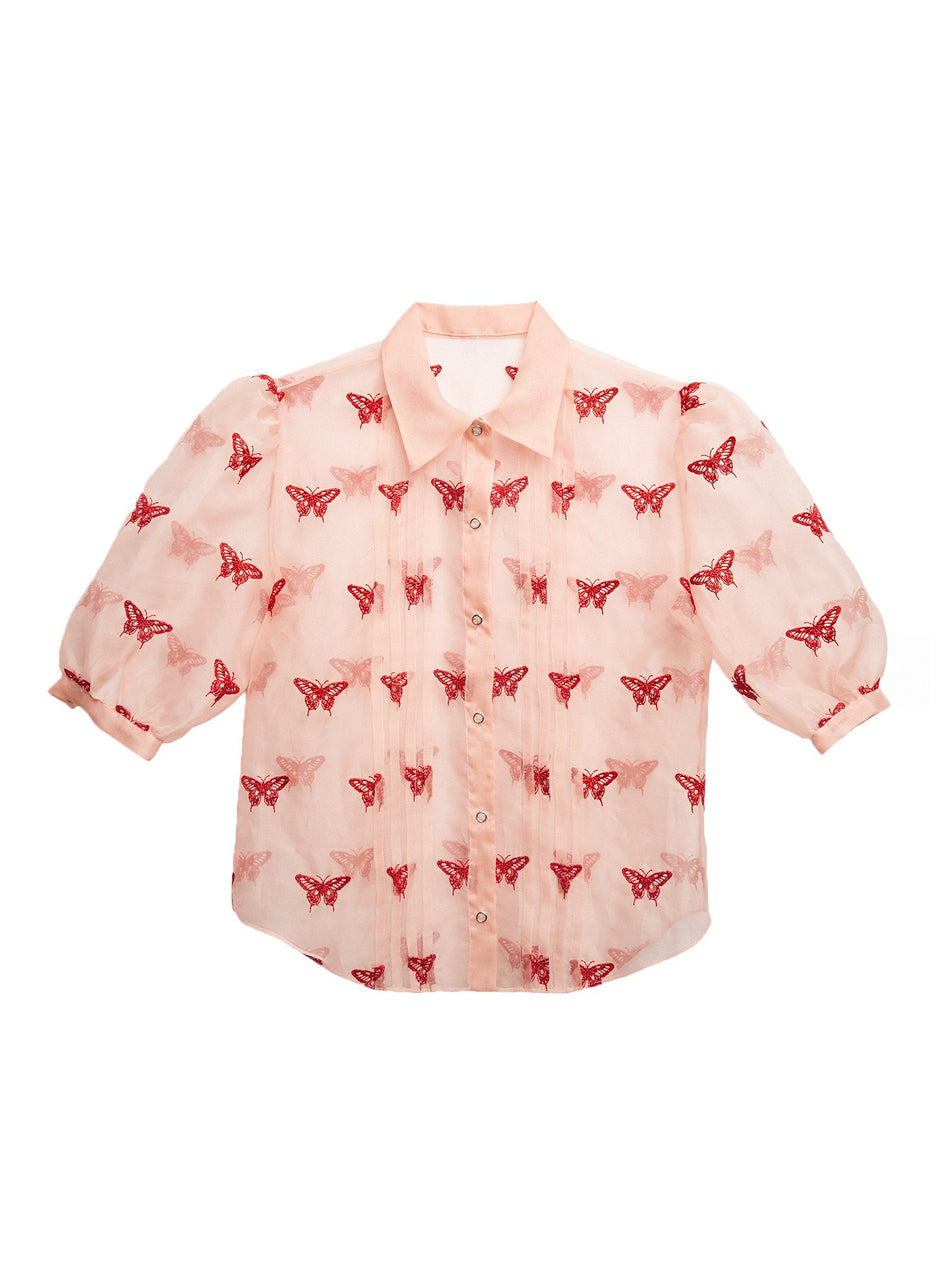 Your love gives me wings, like a butterfly. Features an allover butterfly pattern and pin tuck detailing. Button up front with 3/4 bishop sleeve. Show off the Magnolia Lace Demi underneath and pair with matching Butterfly Embroidered Mini Skirt for a flawlessly flirty look.Â
