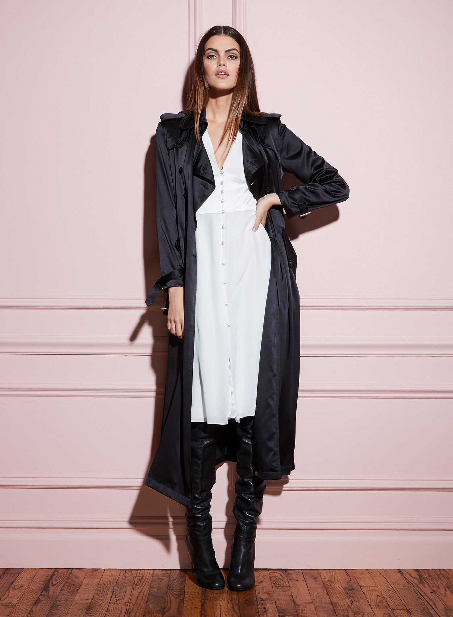 Our figure flattering ivory Corset V-Neck Dress is our anytime go-to this season. 3/4 length cuffed sleeves. Silk button closures along front. Hem hits just below the knee and features a center front slit.