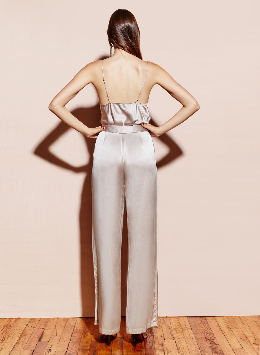 Spring 18: Our lustrous Cowl Neck Spaghetti Strap Cami now in platinum is simple and chic. Bias cut silk charmeuse. Adjustable spaghetti straps and draped cowl neck. Perfect for dressing up a pair of boyfriend jeans or paired with the Corset Wide Leg Pant.