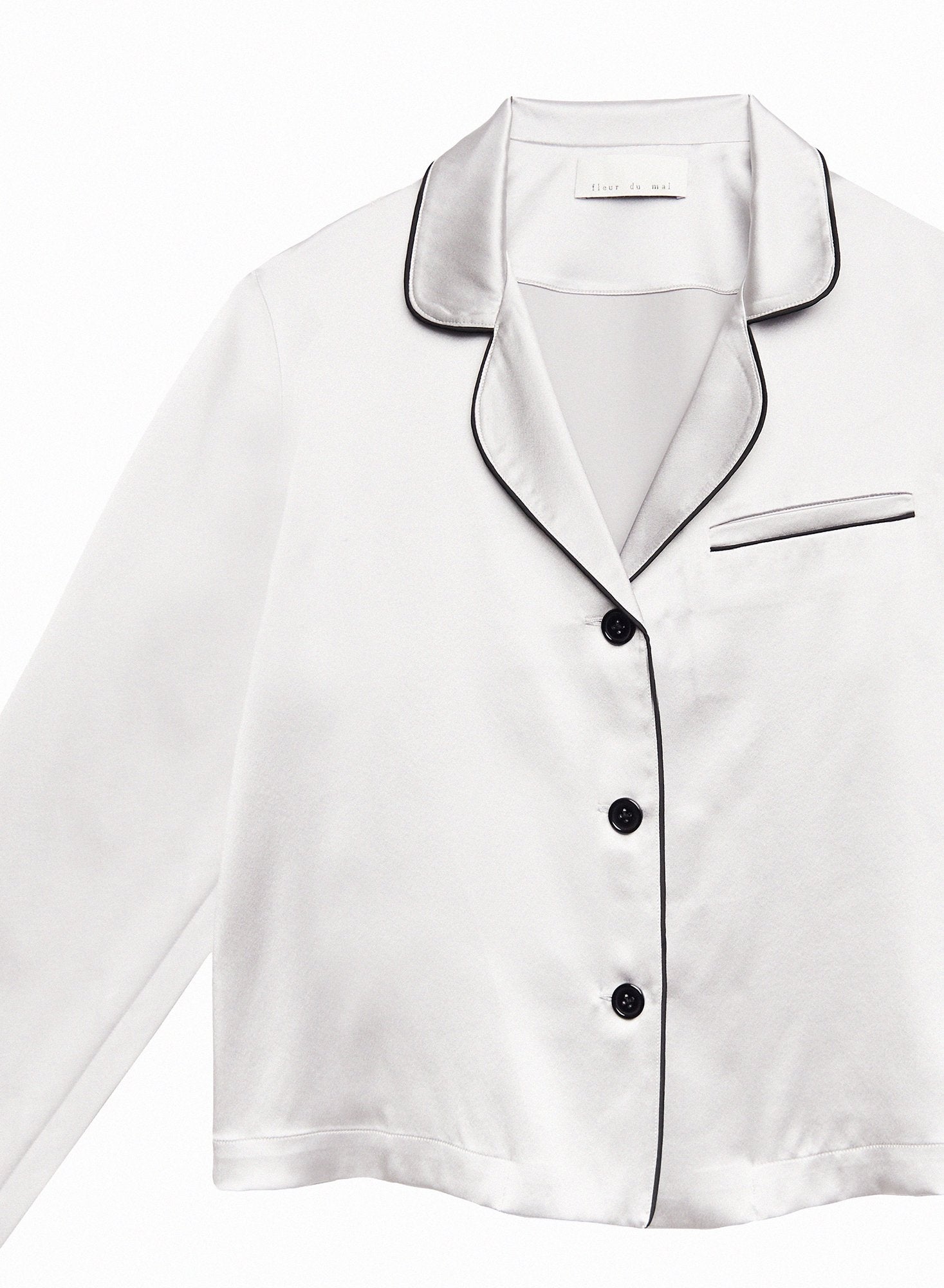Going platinum. Decadent silk satin pajama top featuring front buttons, contrasting black trim and pocket detail. Pair with the matching Bedroom to Boardroom Pant for a chic set that works perfectly on the streets on in the sheets.Â