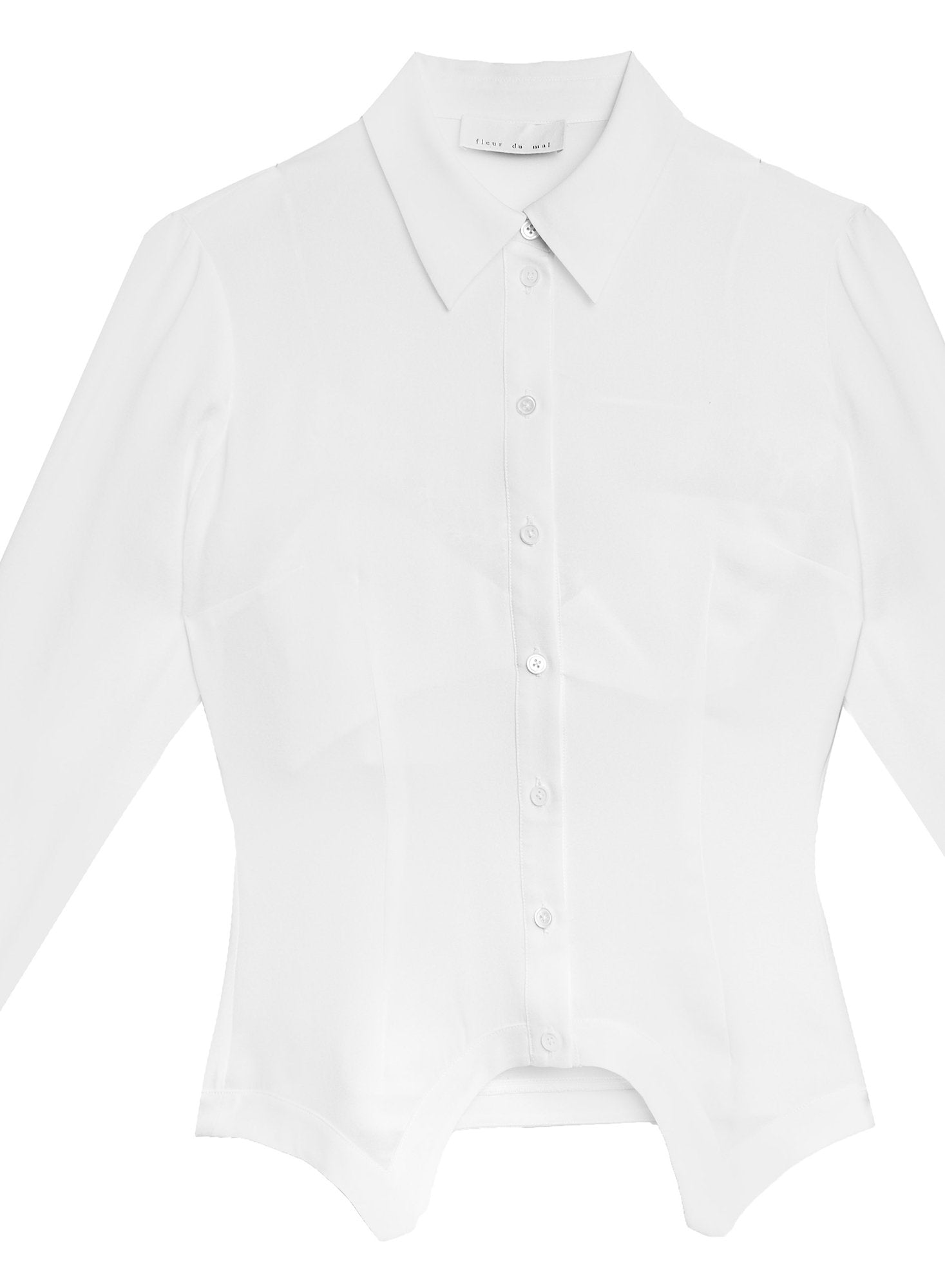 Get on top. Our Garter Shirt with Bralette is a collared button down with unique garter shape hem detail. Princess seams at front and back to flatter your figure. Cut from silk georgette with a removable inner bralette for added coverage. Take to the boardroom with the Garter Seam Skirt, or straight to the bedroom with the Bunny Embroidery Garter and Thong.