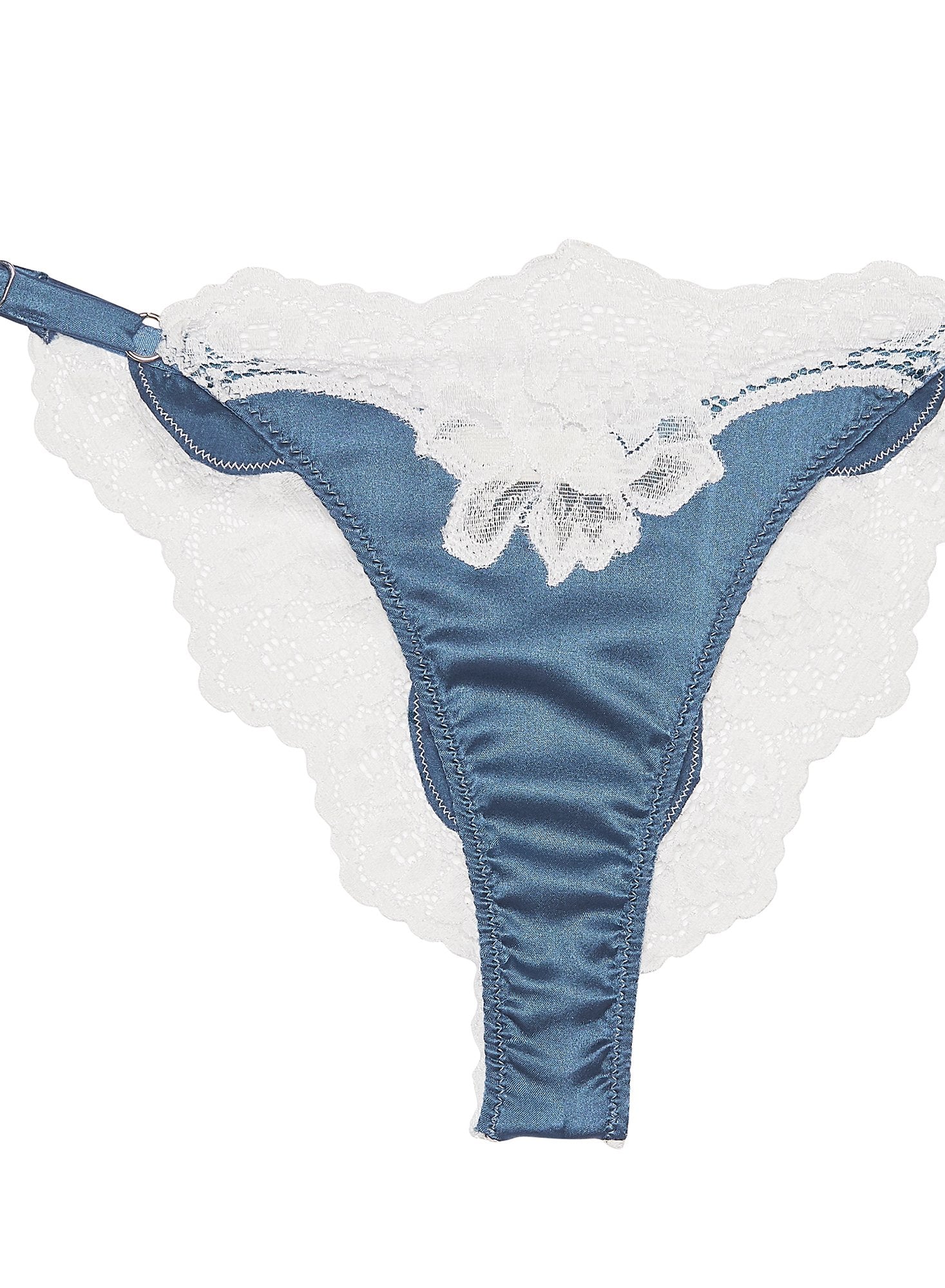 Our James Lace Cheeky in mylos blue. Trimmed with delicate lace, silk covered side straps and enticing scalloped lace down the back creating a seductive peekaboo detail. Pair with matching James Lace Lined Demi Bra.