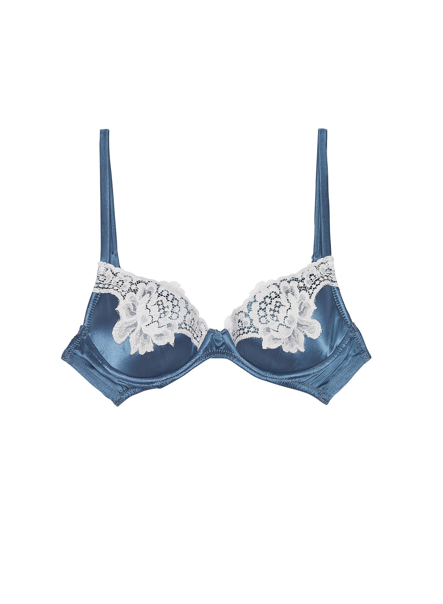 Our quintessential lace bra in mylos blue offers everyday support and structure with underwire cups, adjustable straps, and lace trim. Built-in lightly lined cups provide subtle shape and lift. Lined in Silk. Finished in scalloped lace that frames your bust. Pair with the matching James Lace Cheeky.