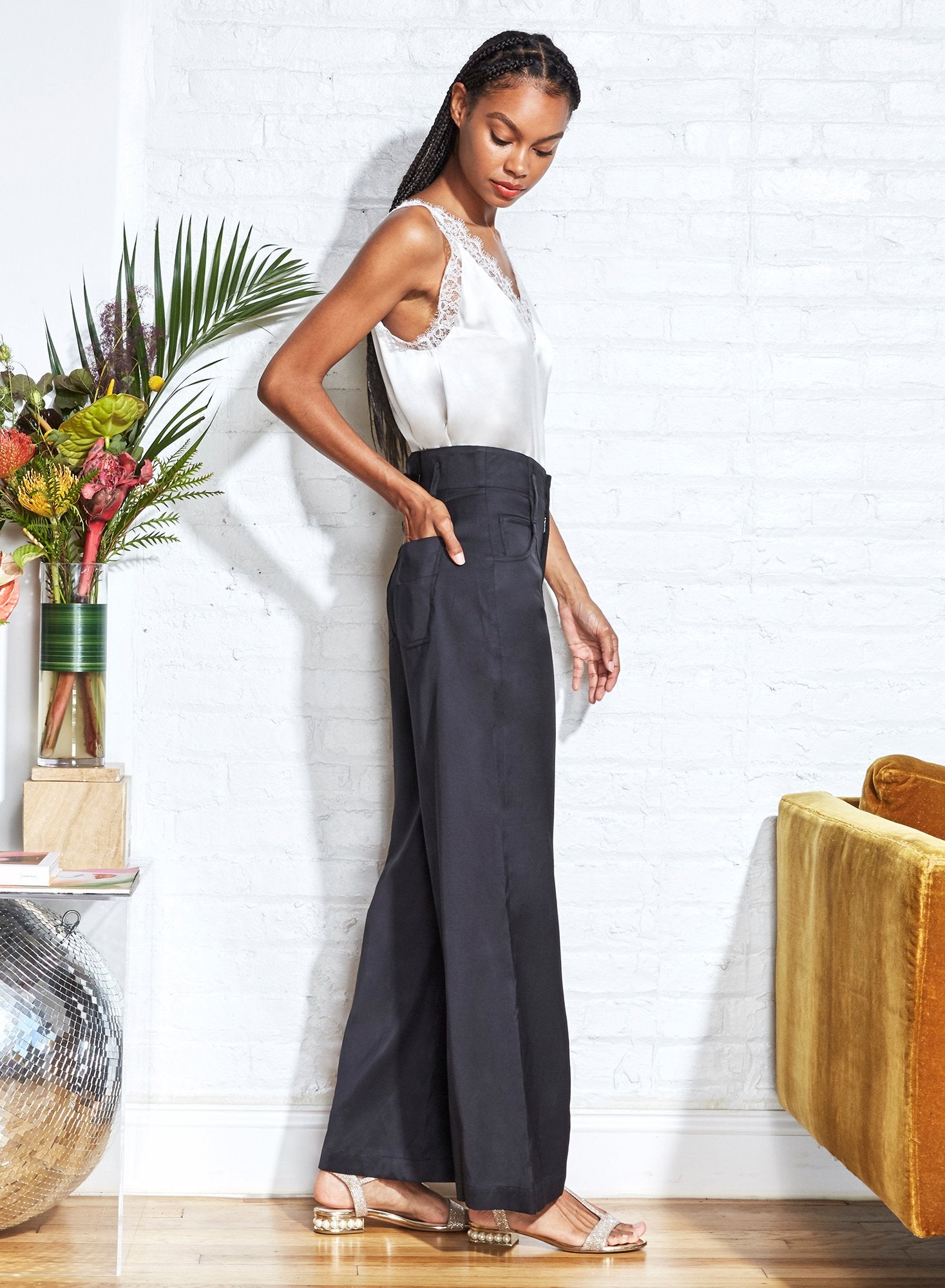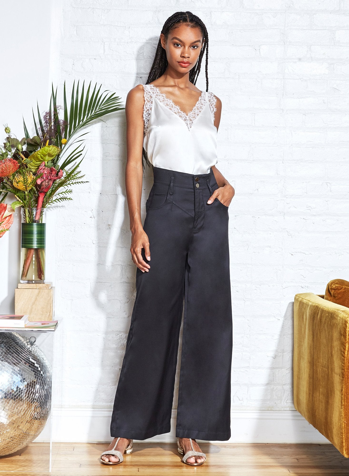 Your wear-with-everything chic camisole. V-neck in front and back trimmed with delicate French leavers lace. Ultra flattering a-line bodice. Wear yours with the Twill High Waist Jean.