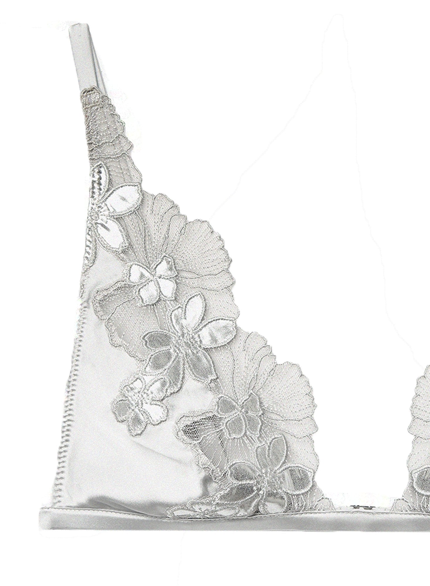 Your silver lining. Our violet triangle bra features beautiful violet embroidery accented with silver foil. with a scalloped edge. Smooth silk bands and soft cups. Back hook closure and adjustable straps. Perfect worn with the matching high waist panty and Fil Coupé Kimono.