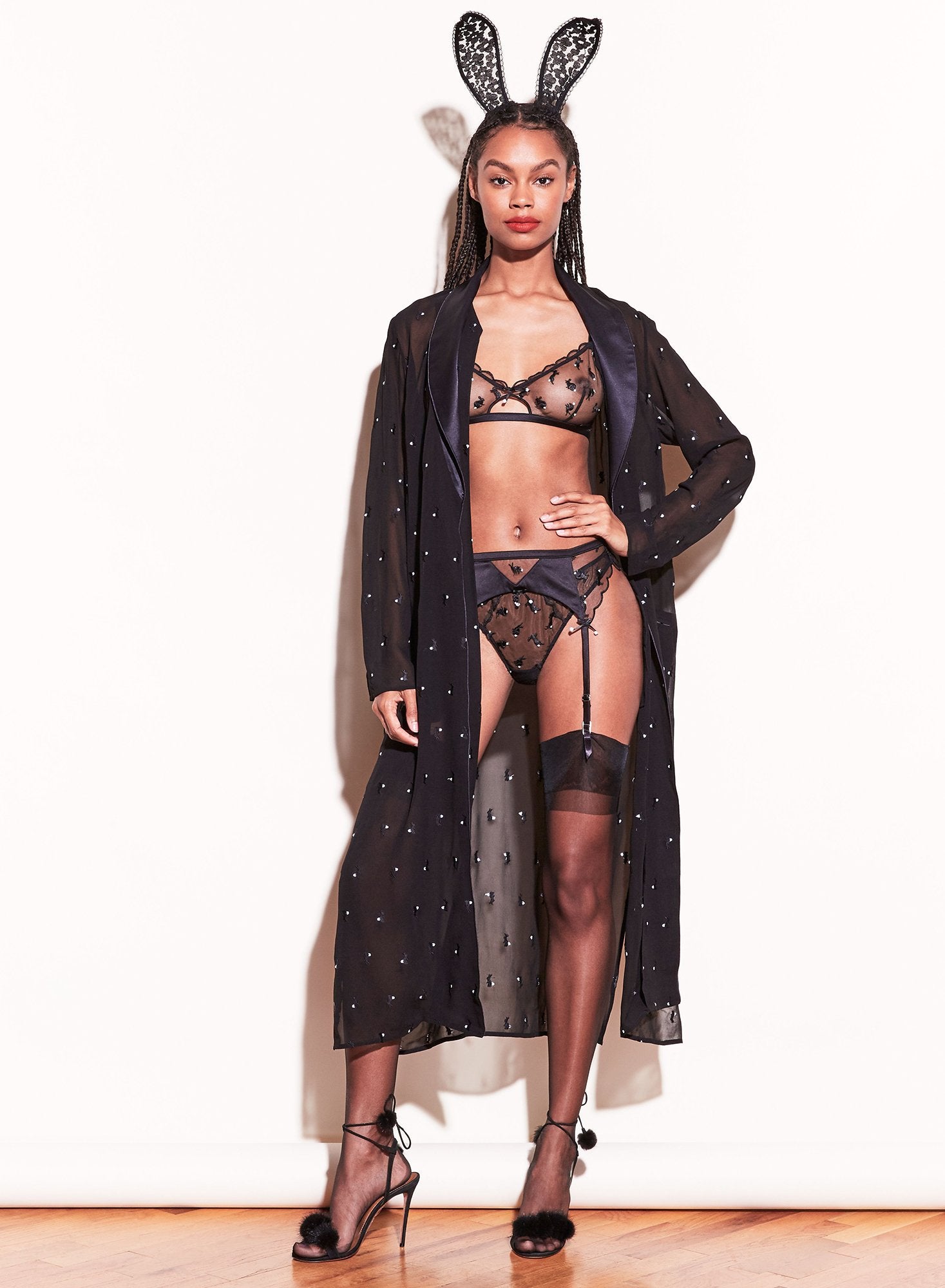 Hustler, baby. Our Bunny Embroidery Smoking robe is unlined with allover flirty bunny embroidery. Features contrasting satin collar and removable belt tie. Midi length. Pair with a cigar and the matching Bunny Embroidery Triangle Bra and Thong for a ultra sexy after dark look.