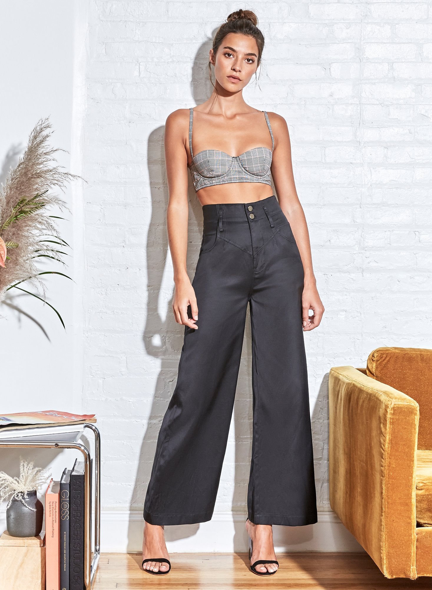 Check up on it. Our Checked Bra Top with molded cups and exposed back zipper. Italian plaid suiting fabric has light stretch allowing for comfort and wearability. Fully adjustable straps for a customized fit. Pair with the Twill High Waist Jean for a chic and sexy look that will take you from happy hour to after hours.