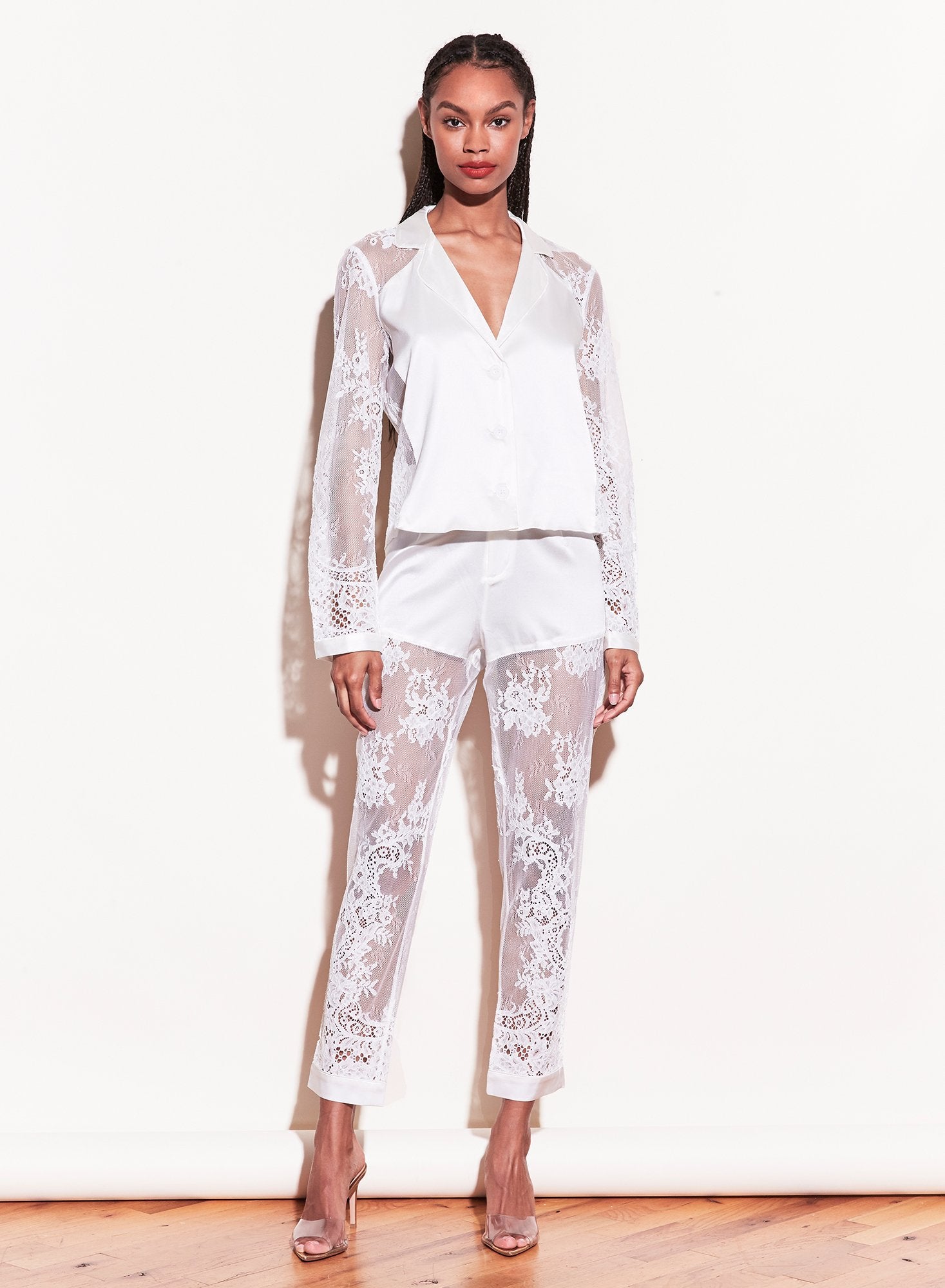 Silky smooth. Long Sleeve Pajama Top with solid silk paneled body and all over sheer lace sleeves and back. Contrasting solid silk cuffs. Pair with the matching PJ Pants for an intoxicating bedtime set.
