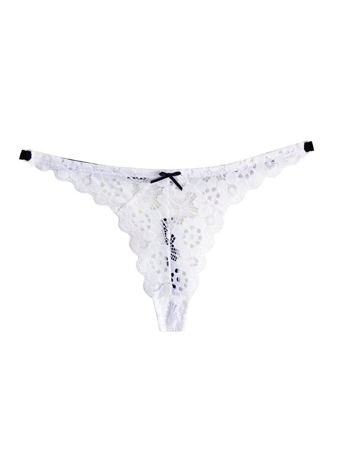 Stretch French lace eyelet thong. Slim band along sides. Sits flat, with leather bow at front. Pair it back to the Crochet Lace Balconettte Bra.