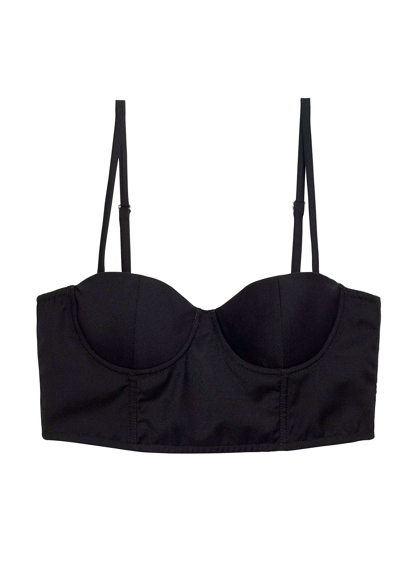 Holiday or bust. Our Cupped Bustier Top is our favorite top for day or night. Soft boning with structured underlined cups. Exposed back zipper & adjustable straps. Pair it with the V-Yoke Trouser for an all black everything moment.
