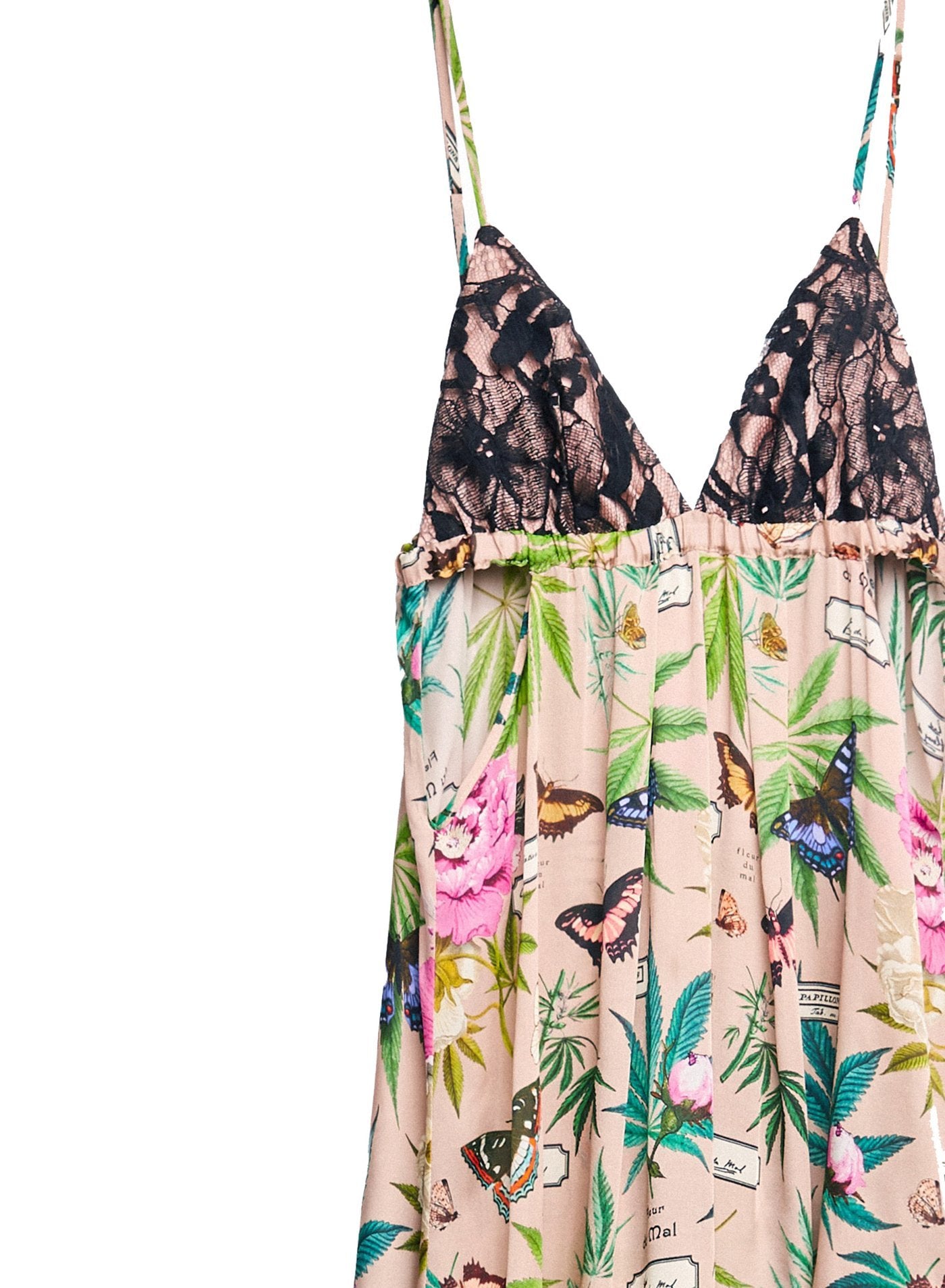 Our papillon botanical printed silk dress is a smoking hot staple. Dress it up with some strappy metallic heels or wear it over your swimsuit for a daytime beach frolic. French lace cups lined in Silk. Elastic under bust. Adjustable straps. Flowing skirt. The Rendezvous Bag is the perfect accessory to top off this look, whether you're running uptown to downtown or off to St.Tropez.
