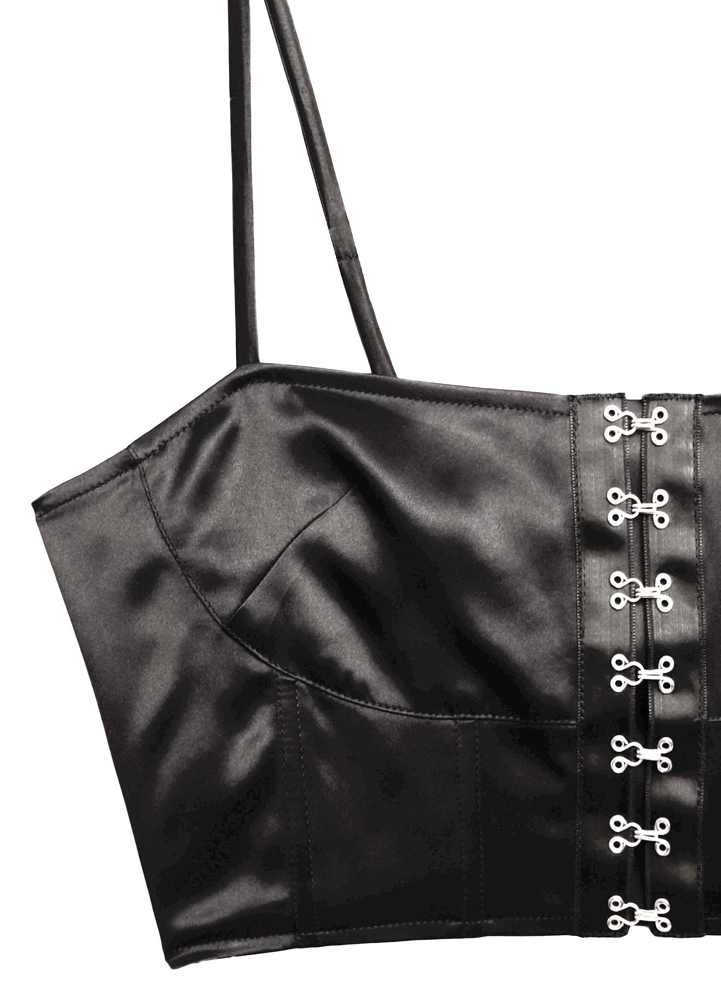 You've got me hooked. Our Hook & Eye Bustier Top features soft boning with structured underlined cups. Front hook & eye closure and adjustable straps. Pair with the matching Hook & Eye Corset Waist Pants or Bermuda Short for a sexy monochromatic look.Â