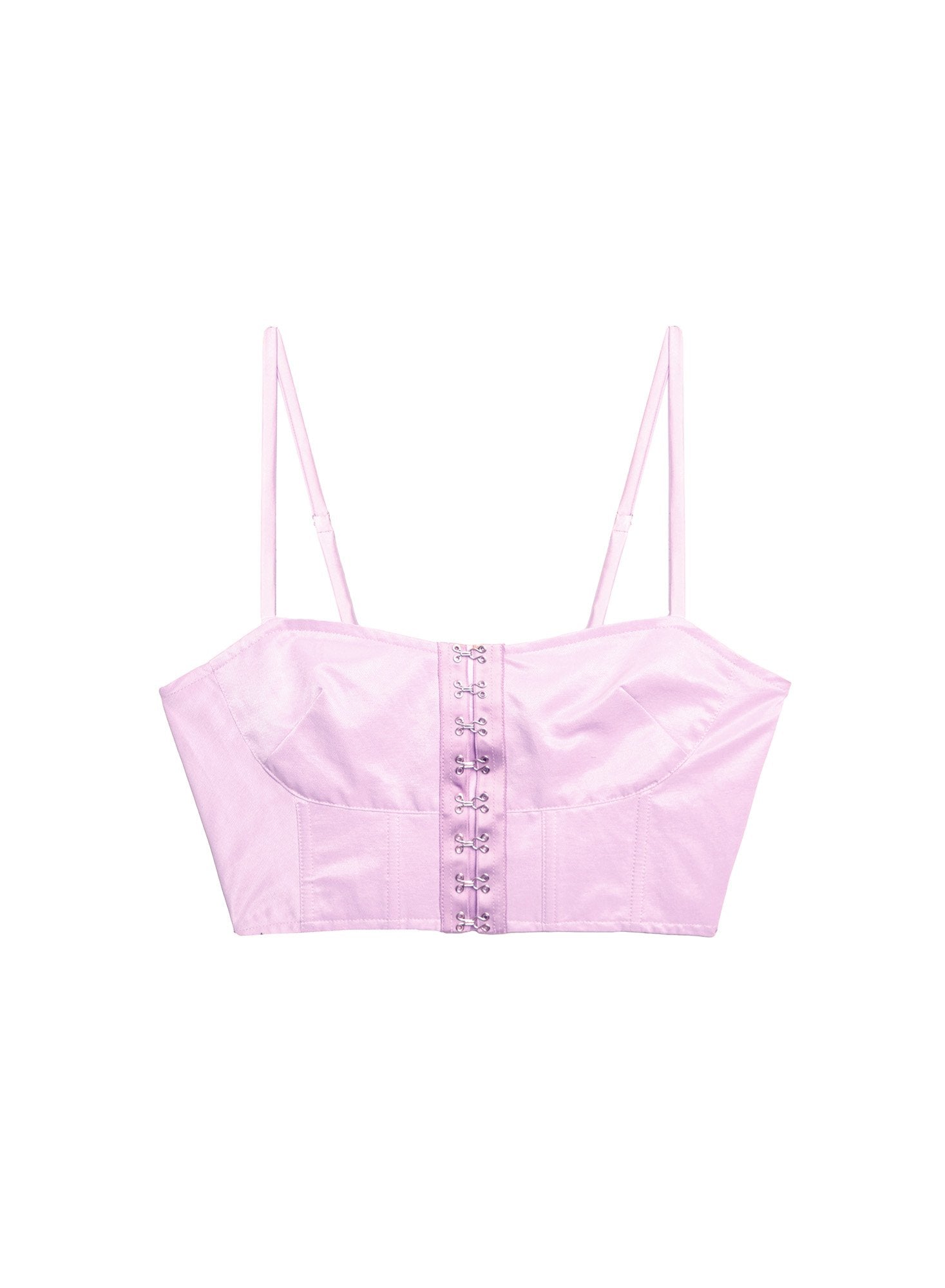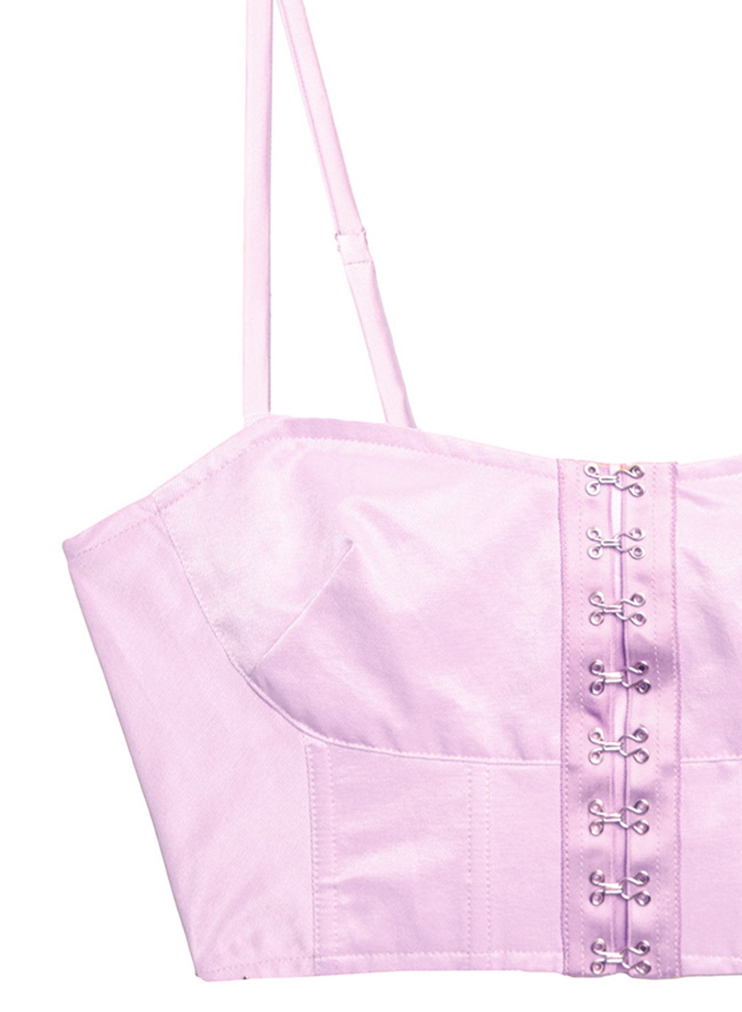 You've got me hooked. Our Hook & Eye Bustier Top features soft boning with structured underlined cups. Front hook & eye closure and adjustable straps. Pair with the Twill Belted Trouser or the matching Hook & Eye Corset Waist Pants for a sexy monochromatic look.