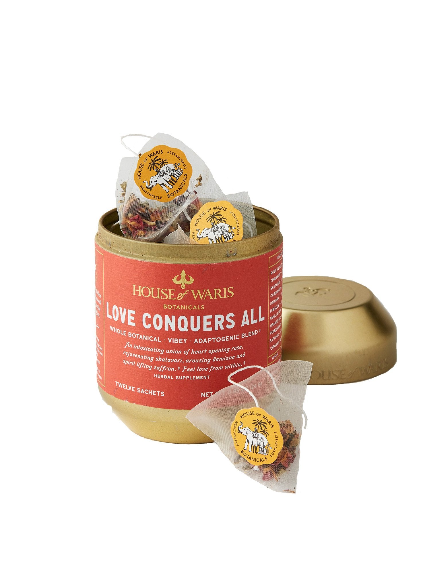 Feel love from within. Founded by actor and designer Waris Ahluwalia, House of Waris Botanicals is part of Waris' ongoing commitment to creating a more thoughtful way of living. Love Conquers all is an intoxicating union of heart opening rose, rejuvenating shatavari, arousing damiana, and spirit lifting saffron. A natural aphrodisiac to enhance the quality of lovemaking. Contains 12 individual sachets.