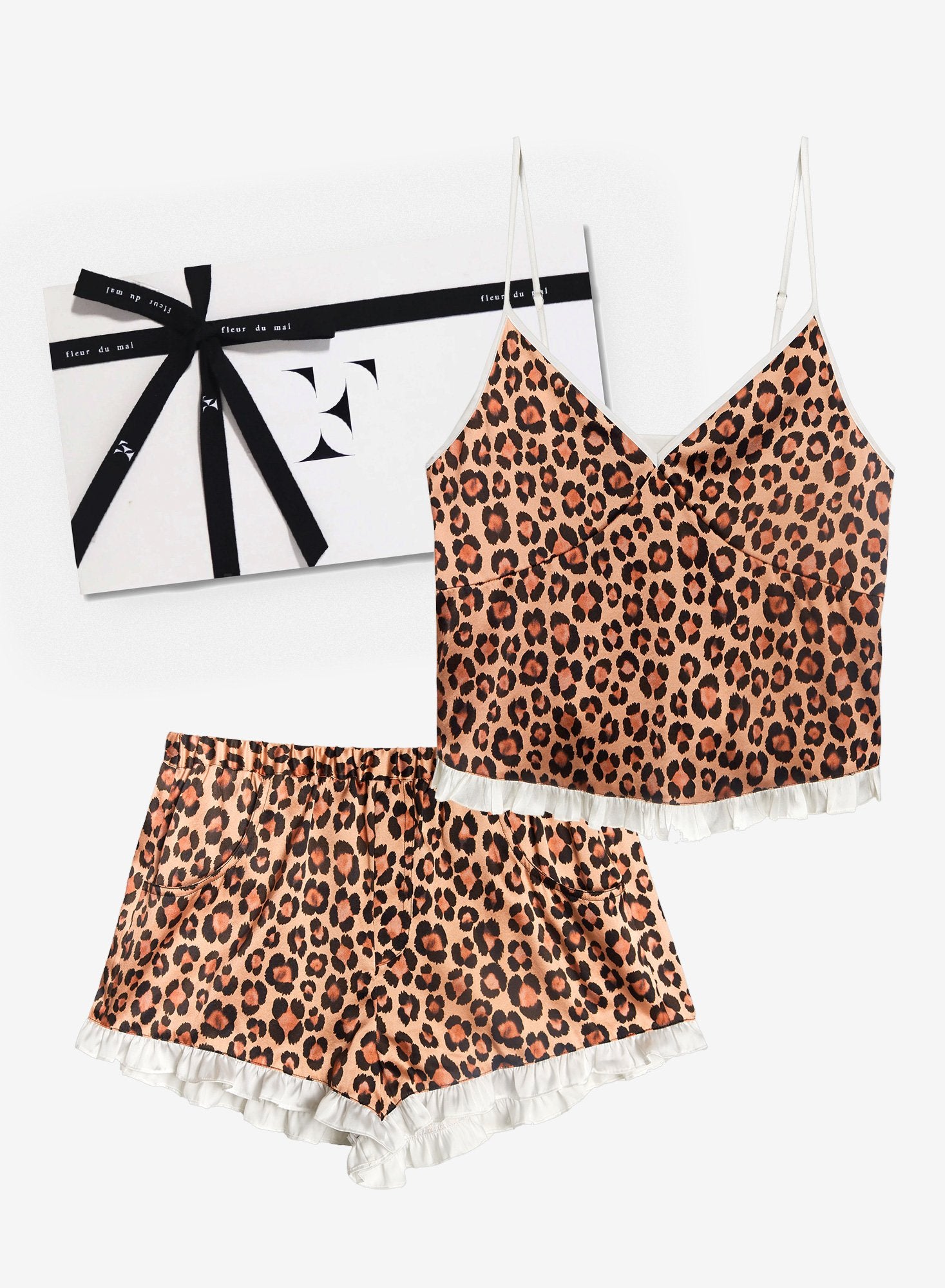For the ones with a wild side. Our Leopard PJ Gift set features our signature pajama set in our new and innovative washable silk charmeuse. Ultra luxe Washable Silk Cami with adjustable straps and ruffle detail, plus matching Washable Silk Ruffle Shorts with pockets and contrasting white ruffle at hem. Beautifully gift wrapped in Fleur logo box with a black ribbon.