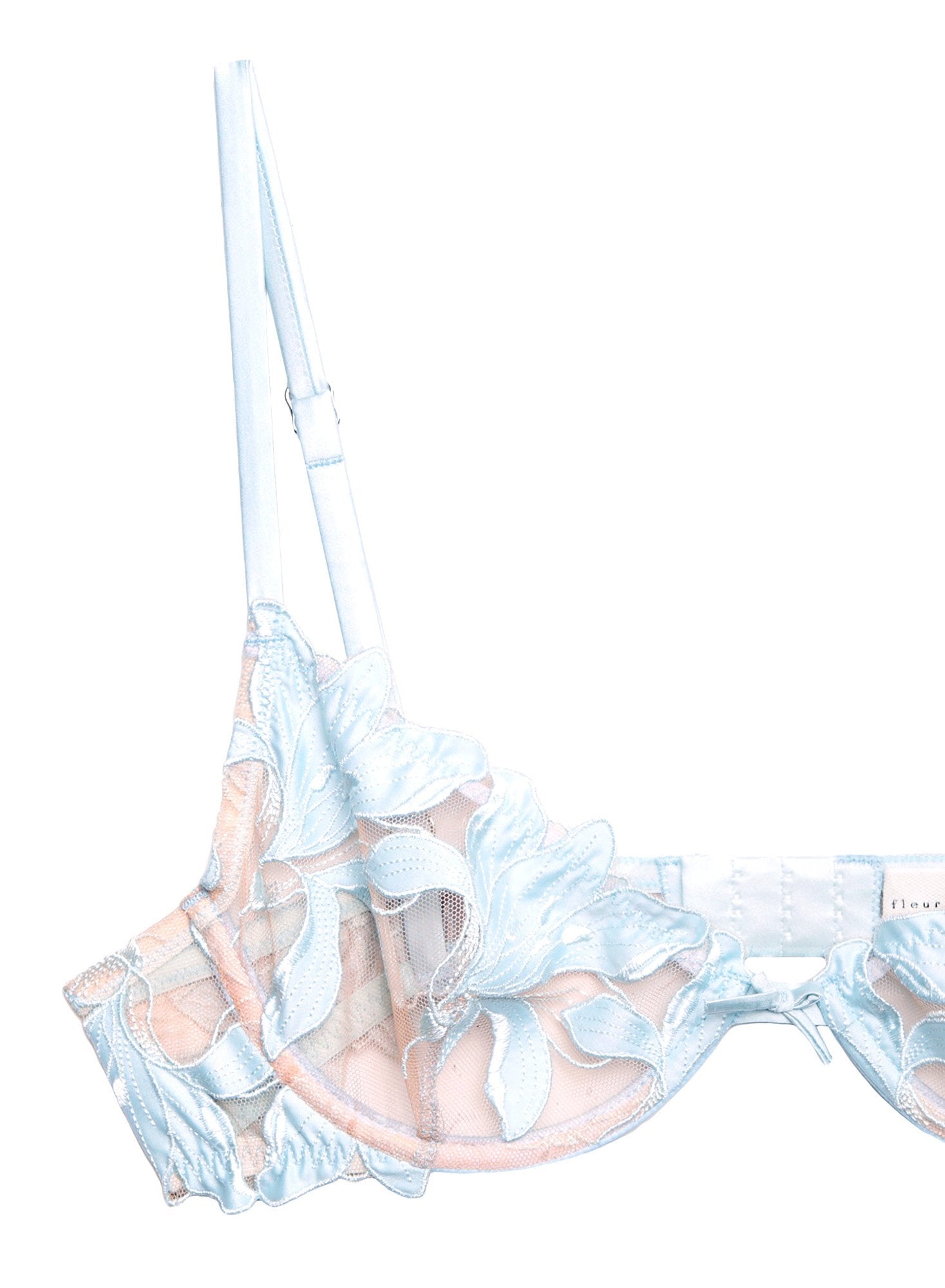 Très Chic. Our favorite bra has large embroidered Lilies that perfectly drape across the body. Underwire with adjustable straps provides subtle shaping and lift. We love to show it peeping through a semi-sheer white tee. Complete the look with the matching Lily Embroidery Hipster Thong and Garter.