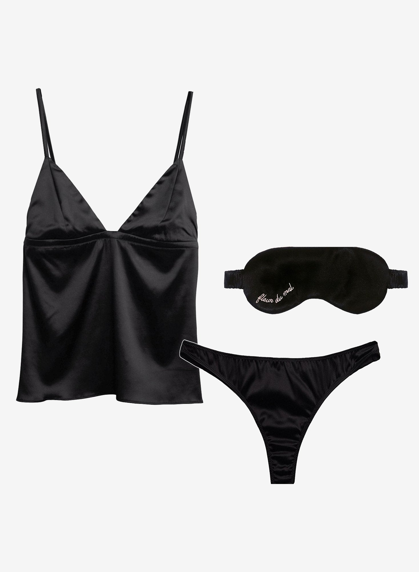 Gift it to me, baby. Our Luxe Sleep Gift Set is the perfect sleep set. Our chic Satin Luxe Triangle Cami features lined triangle cups with adjustable straps. Matching Luxe Thong in black with barely-there feel. Logo Silk Eye Mask gives an extra something special. Beautifully gift wrapped in Fleur logo box with a black ribbon bow.