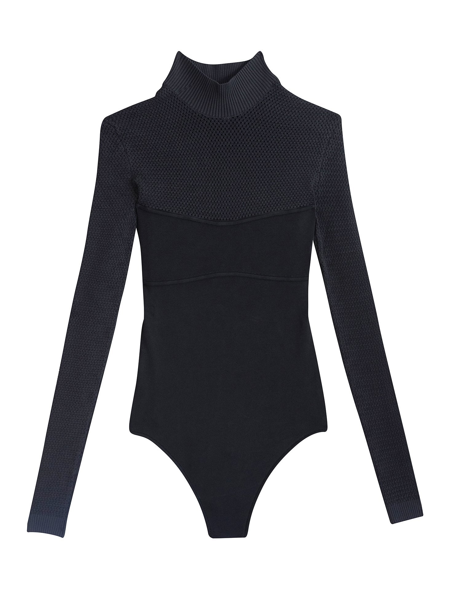 Our long sleeve, luxury stretch Knit Bodysuit with pointelle sleeves and neckline is an essential to heat up this holiday season. Ribbed crew neck collar and cuff detailing, super soft handfeel. Bottom snap closures. Layer it under your favorite slip dress or on its own with the Silk V-Waist Shorts.