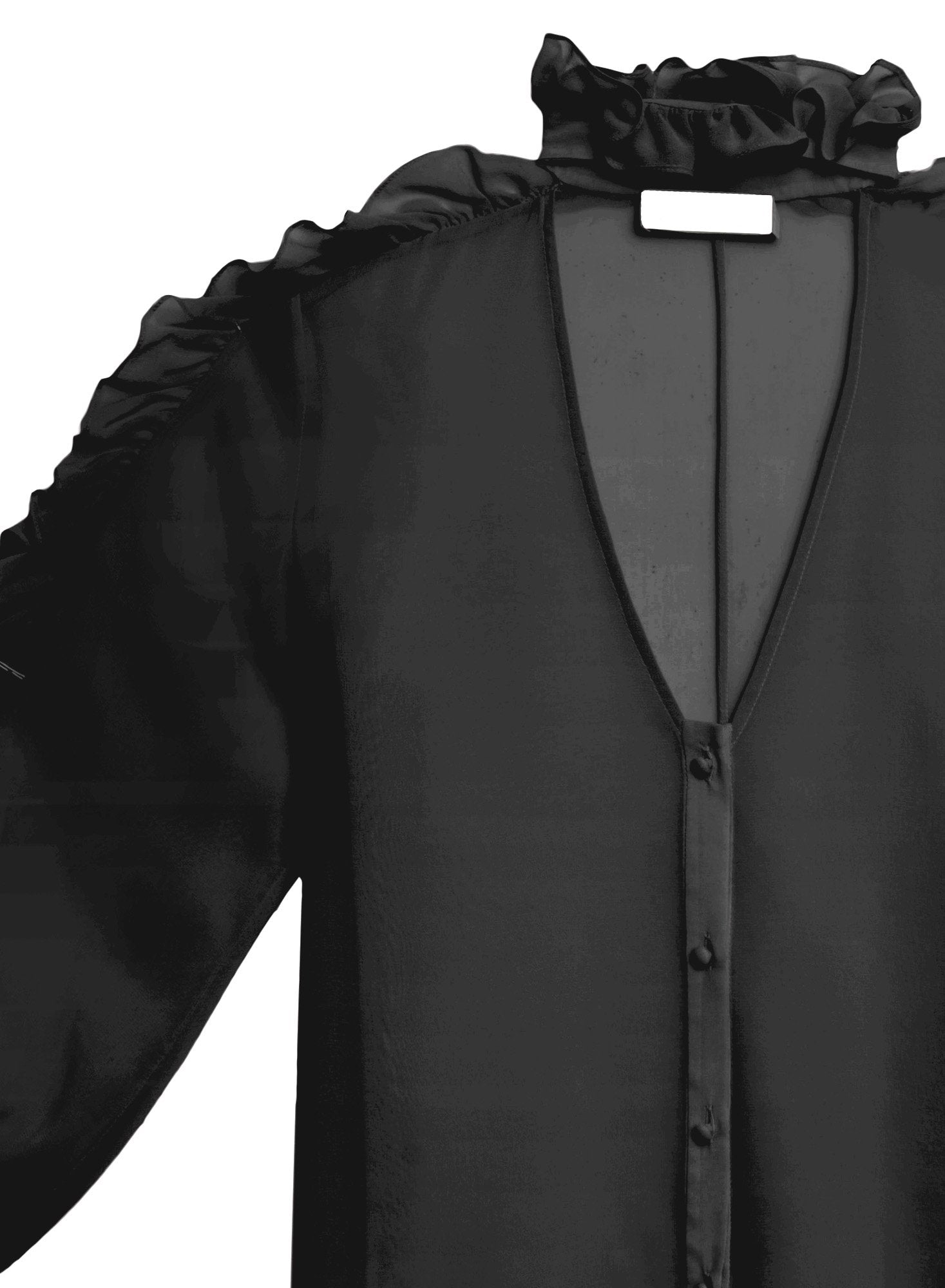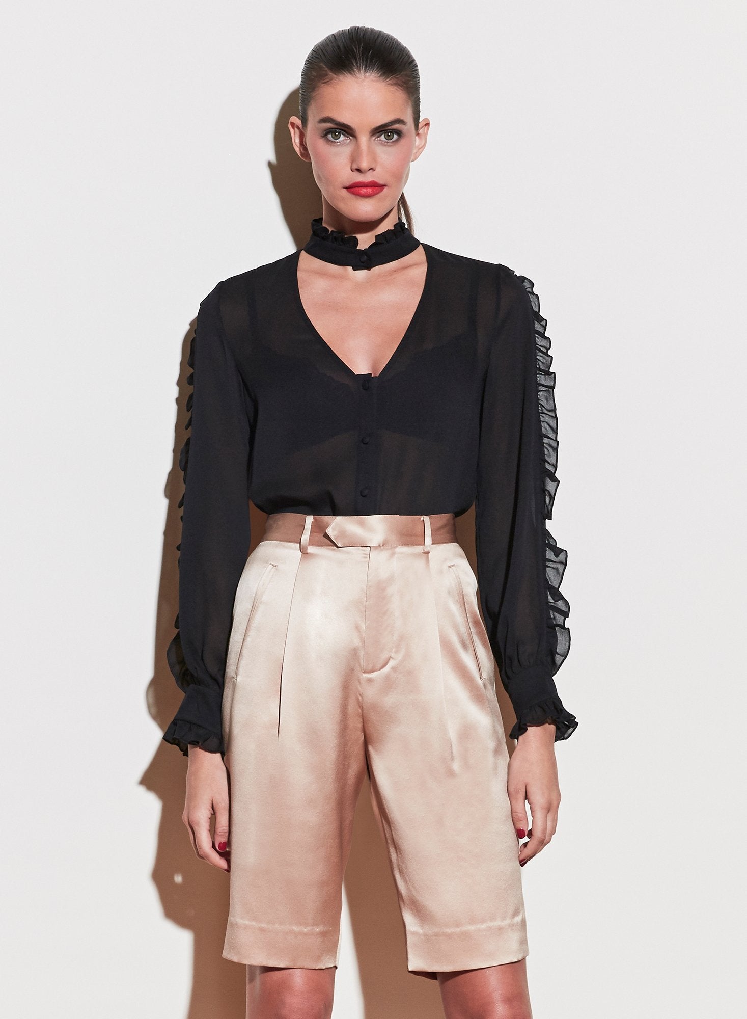 Our Ruffle Neck Blouse features playful ruffle collar and detailing on sleeves. Sexy front cutout to give your décolletage the attention it deserves. Cuffed wrists with button fastenings. Complete this ultra chic look with the Bermuda Short.Â