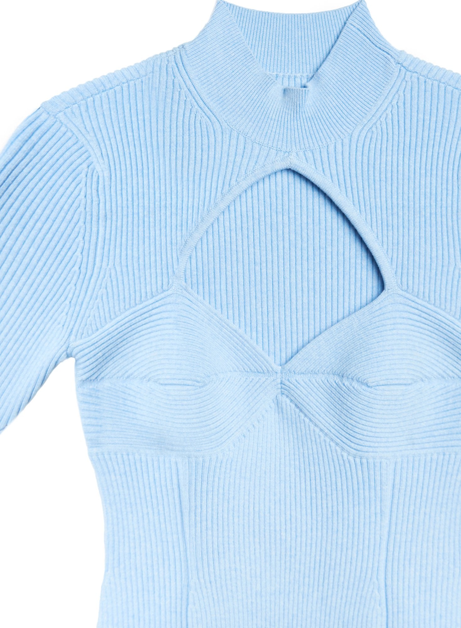 Cut it out. Our Short Sleeve Corset Knit Top with directional ribbing to sculpt and contour your figure. Features playful cutout and mock neck. Fitted style with garter inspired hem. Complete this ultra chic set with the matching Knit Rib Short.