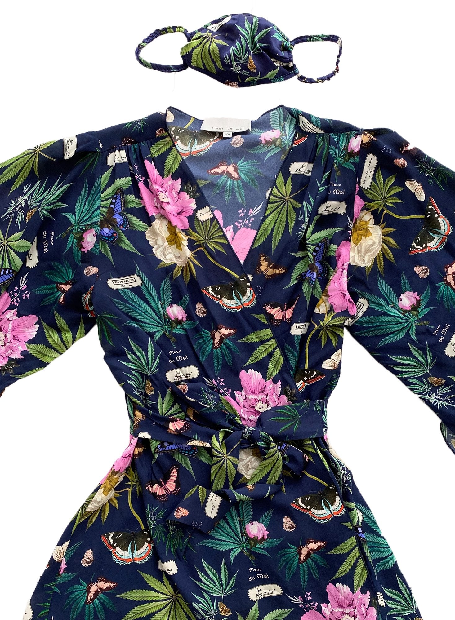 Our Silk Face Mask in our signature Papillon print, featuring butterflies, cannabis leaves and flower blossoms is light, breathable, and chic. 100% Silk and lined with cotton. Features a side opening for disposable filter. Silk covered elastic bands for extra comfort.