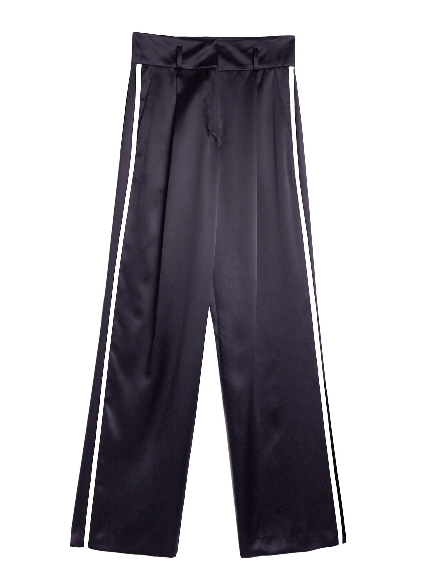 Wanderluxe. Our Silk Piping Belted Pants with removable belt. Flattering high waisted fit with small front pleats. Contrasting ivory piping down sides. Straight leg. Complete this ultra chic set with the matching Piped Double Breasted Blazer.