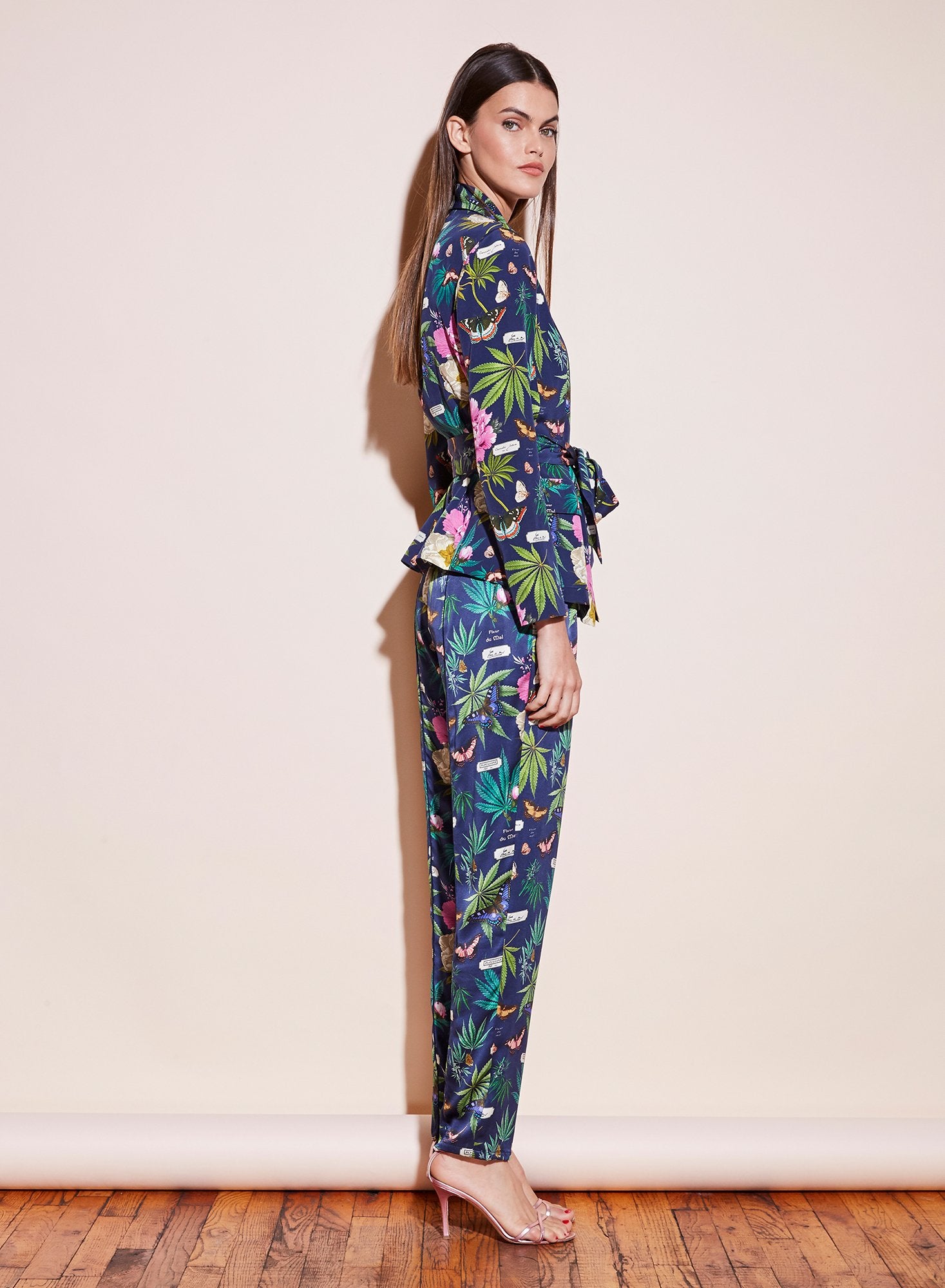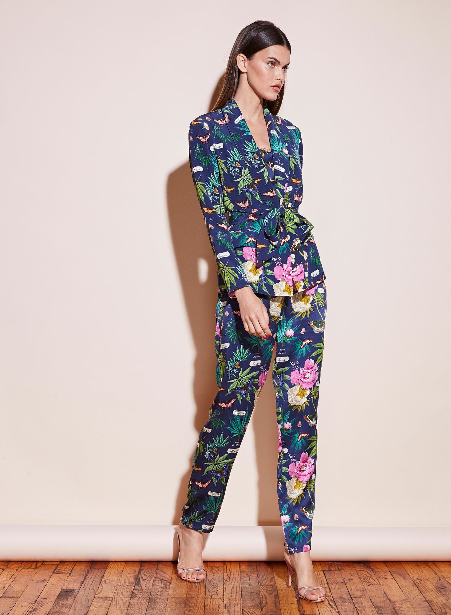 You smokeshow. Our ultra-soft shawl collar smoking jacket. Cut from botanical papillion printed silk and features a shawl collar. Removable silk sash. Front pockets. Pair it with the matching PJ Pant for a smoking hot bedroom set or wear it out over denim.Â
