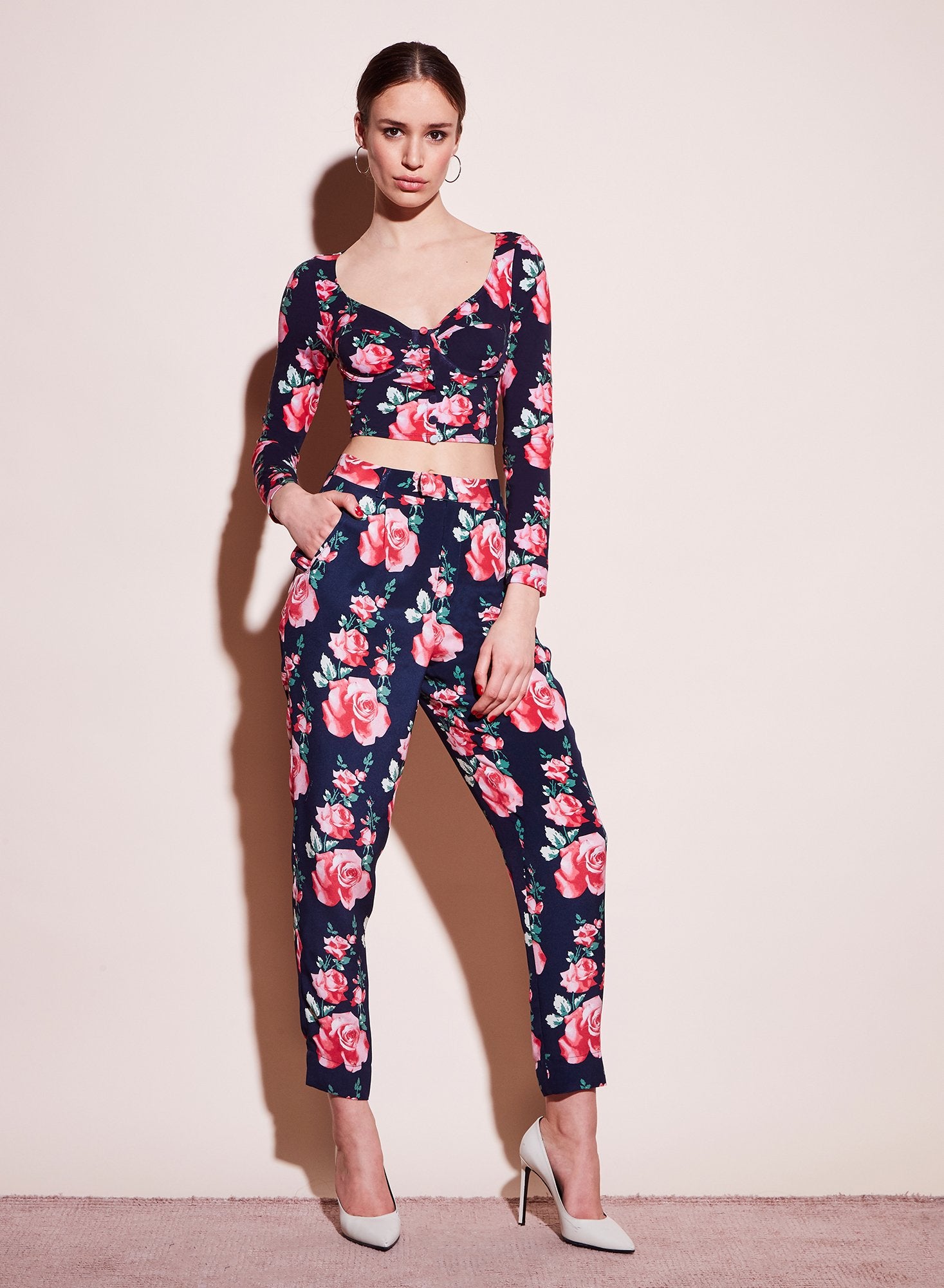 Kissed by a rose. Our silk Tapered Pant in a chic all over floral print which features the Fleur du Mal logo. Banded waist features belt loops. Side and back pocket detailing. Pleated tapered legs hit just above the ankle. We love it with the Luxe V-Neck Cami for casual yet feminine look.