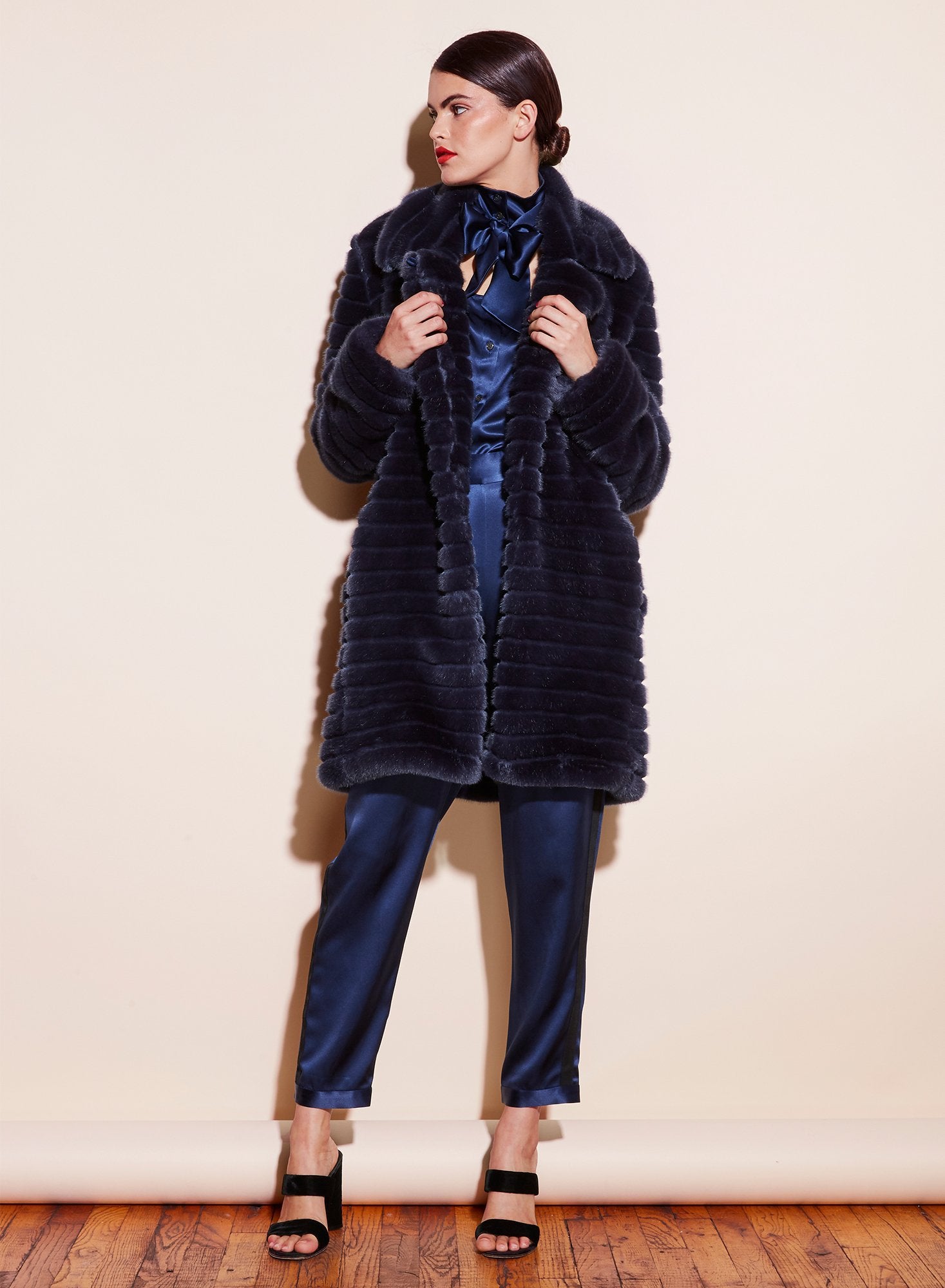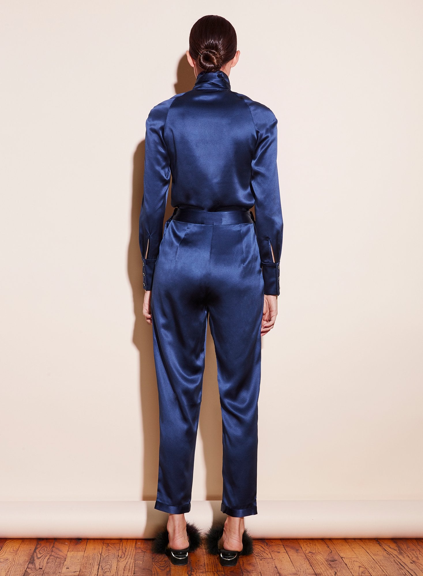 Burning the midnight oil. Our Tie Neck Décolleté silk blouse features collar and neck tie detail. Sexy front cutout to give your décolletage the attention it deserves. Cuffed wrists with button fastenings. Complete this ultra chic look with the matching Indigo Tuxedo Pants. Â