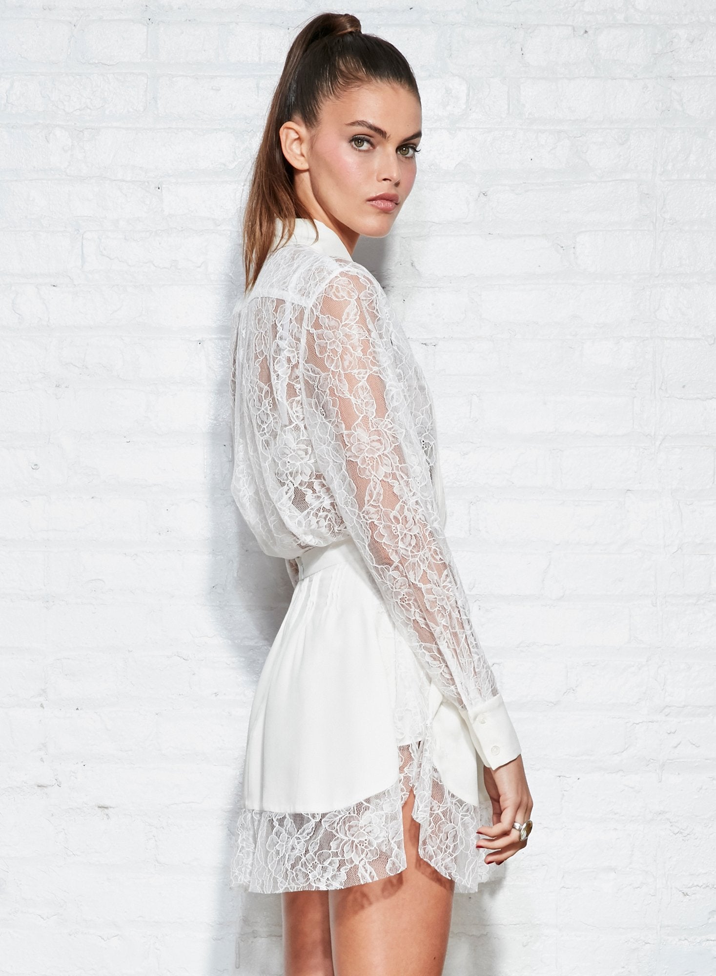 Lace me up. Our Tuxedo Bib Shirt features a delicate lace body with silk pleated bib detail at front. Oversized fit with button closure and a menswear inspired curved hem. Layer over the Lily Embroidery Plunge Demi Bra and Thong look where business meets pleasure.